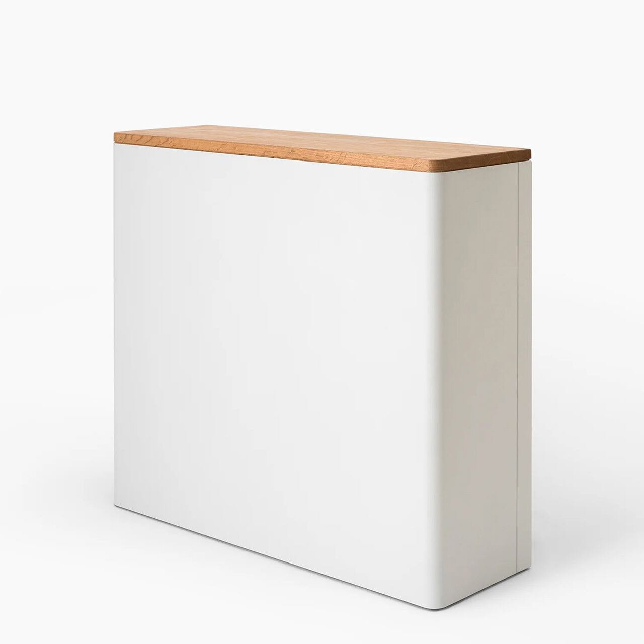 4人分の備蓄品がすっきりと収まるサイズです。内部には取り外し可能な中板が付属しています。本体のスチール部分は、艶を抑えたマットな質感が特徴です。日本の住まいの空間に調和するようオーク材を天板に使用し、正面の角は丸みをもたせ柔らかな印象に仕上げました。複数組み合わせて壁に沿わせ棚のように設置することもできます。