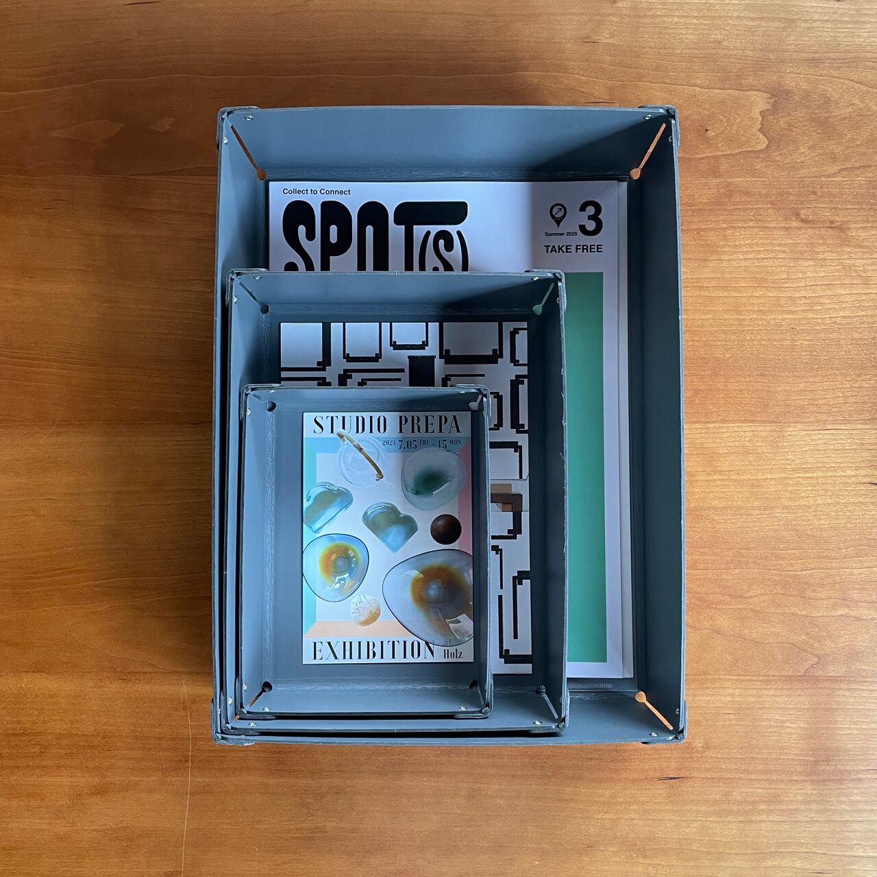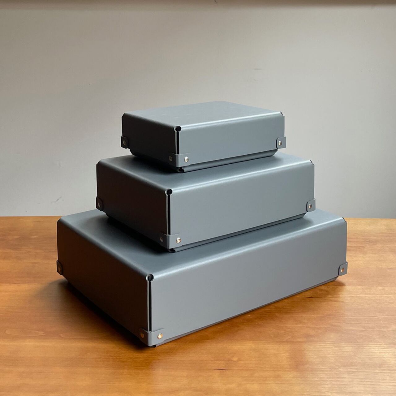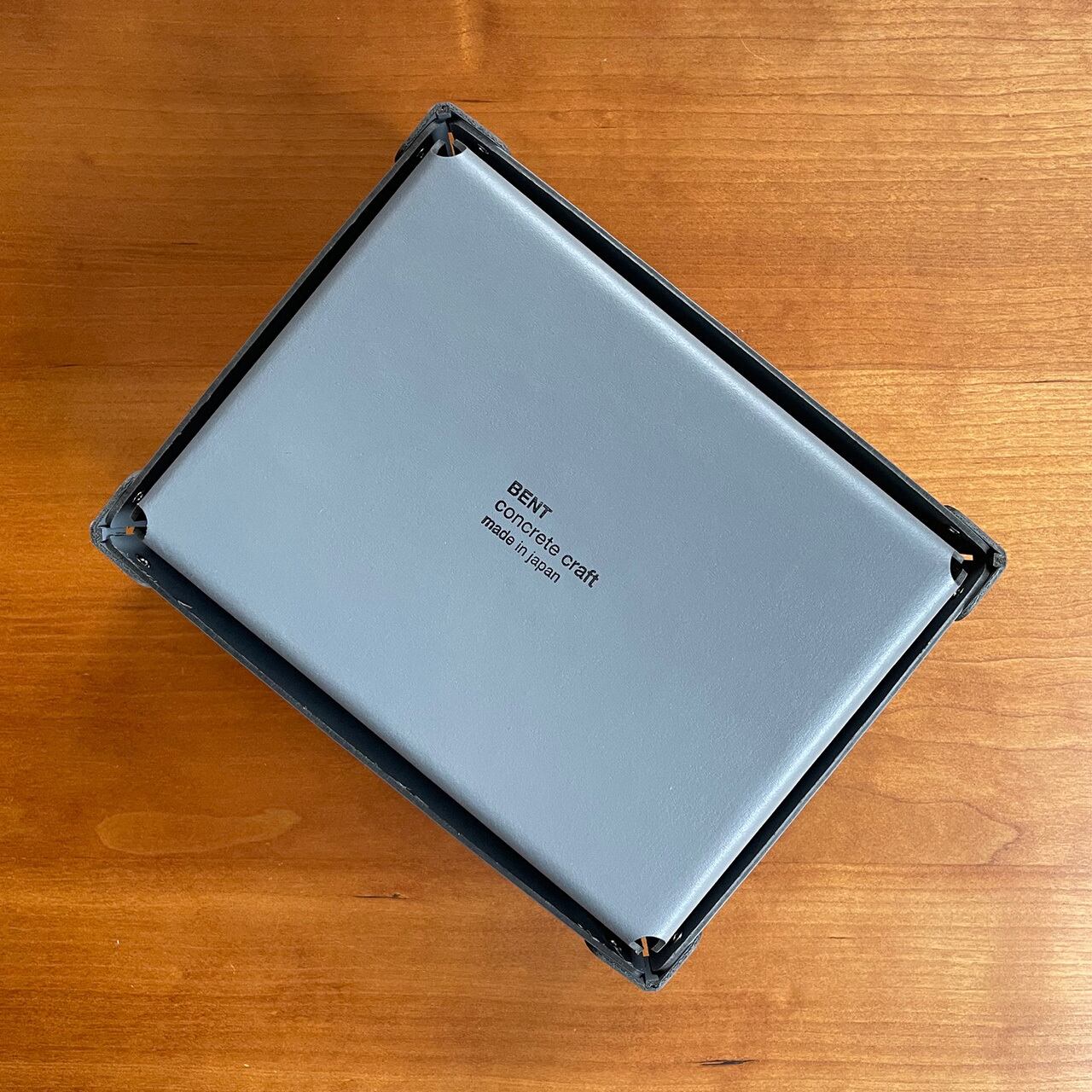 BENTはヨーロッパで開発されたリサイクル可能な紙製の繊維ボード「パスコ」を折り曲げて、四つ角を同素材のパスコを採用して留めることで、より環境に配慮したフラットな製品に仕上げました。日本では昔から文書や衣料、あるいは身の回りの品の収納道具であった「行李」をイメージして再構築。身と蓋が同じ形状なので、それぞれ独立した2個の収納ボックスとしてもご利用になれます。パスコは靴の中底や、通函、トランクや車の内装材などに使用される素材で、非常に硬質な素材でありながら柔軟性に優れています。通常では折り曲げる加工の際に罫線を用いて折り曲げます。そうするとどうしても、折り曲げ線がついてしまいます。このBENTシリーズは罫線を使わずに曲げることによって線の跡が付かず、滑らかで美しい曲線を可能にしました。素材の特性と独特な風合いを生かし、シンプルでありそうで無かった質感の収納ボックスです。サイズ(A4,A5,A6)に応じてリビングやデスク回りなどに重宝しそうです。
